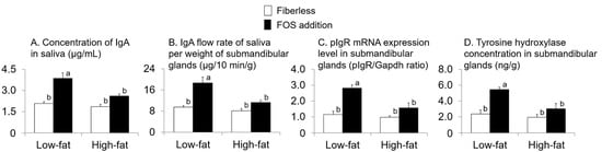 In this study, we examined the effect of the amount of fat and FOS supplementation on IgA FR-saliva. To eliminate the effects of obesity associated with excessive fat intake in this experiment, feed intake was adjusted so that the weight gain of rats in each group was equal. The amount of fat added for the high-fat group was set at ~40% of the total energy intake, similar to high-fat intake in humans []. The amount of fat added for the low-fat group was set at approximately 14% of the total energy ingested in 1965, which is before the increase in blood cholesterol in Japan became a public health challenge []. A fat intake of 14% of the total energy is considered the low-fat intake of people currently []. Therefore, the results of this study provide suggestions for dietary composition for people, including the younger generation, who are not obese but have a high fat intake.