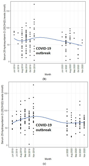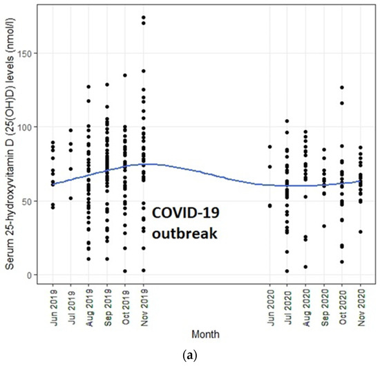 Descriptive statistics were summarized using frequencies and percentages for categorical data (gender) and using mean (SD) for continuous data (age and serum 25(OH)D level). The “pre-outbreak” period was defined as 1 June 2019 to 30 November 2019 and the “post-outbreak” period was defined as 1 June 2020 to 30 November 2020. We also divided our sample into two age groups: young infants (2–6 months) and older infants (7–24 months) based on the presumption that infants may have obtained vitamin D from a greater variety of food groups after six months of age. We implemented two strategies to analyze trends before and after the COVID-19 outbreak. Prior to each analysis, data were plotted graphically to detect trends to confirm the model building strategy. First, regression models were used to generate (a) within-group estimates by examining the effect of time in months on infants’ serum 25(OH)D level overall and by age groups before and after the outbreak and (b) between-group estimates by regressing serum 25(OH)D levels against the pre/post-outbreak group status, adjusting for age, sex, UV index, and month of assessment. Second, given that the change in serum 25(OH)D level, if any, could be gradual as the COVID-19 outbreak worsens, we tested whether infant serum 25(OH) D trends changed after the onset of COVID-19 compared to before COVID-19 using interrupted time series (ITS) analysis which is a quasi-experimental method to determine whether pre- and post-intervention data patterns are different from each other [26]. In this study, the ITS model estimated the baseline slope before the outbreak onset time point (pre-outbreak trend), the change in slope from the baseline trend to the post-outbreak trend (change in level immediately following the onset of the outbreak), and the immediate change associated with the outbreak time point (post-outbreak trend). Trends were approximated to be linear when discontinuities occurred. To check whether the data met the requirements of ITS design, we first plotted the data and visually compared the trend before and after the COVID-19 outbreak. We assumed the linearity of the trend lines within each segment. In addition, we used the Durbin–Watson (DW) test to check for autocorrelation, with a value close to 2 indicating no evidence for autocorrelation [27]. Furthermore, we also considered models adjusting for age, gender, and UV index that might influence serum 25(OH)D levels. All statistical tests and 95% CIs were two-sided; p values less than 0.05 were considered statistically significant. Analyses were done and figures were obtained using R version 3.6.3 [28].