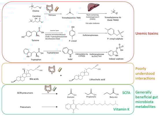 The gut microbiota processes dietary components and secretes bioactive molecules that are absorbed into the circulation. These include vitamins, short-chain fatty acids (SCFAs) and precursors of uremic toxins, all of which may modify CKD progression or CKD manifestations (Figure 1).