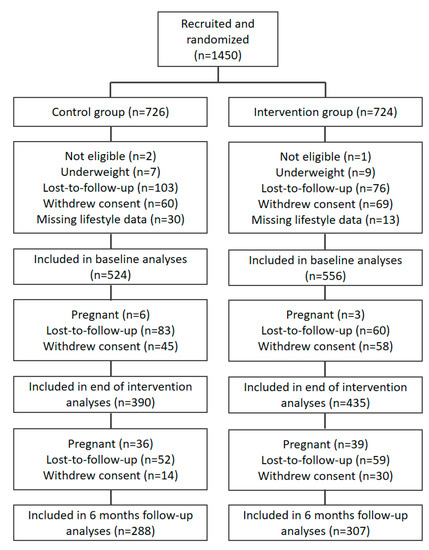 The participant flow is displayed in Figure 1. A total of 1450 participants were recruited, of which 726 were randomized into the control group and 724 into the intervention group. At baseline, 524 control group participants and 556 intervention group participants were included in analyses, at end of intervention respectively 390 and 435, and, at six months follow-up, respectively, 288 and 307 participants (Figure 1).