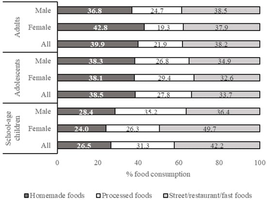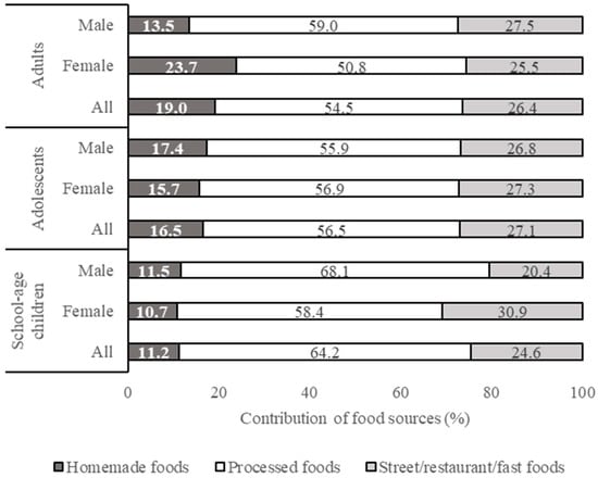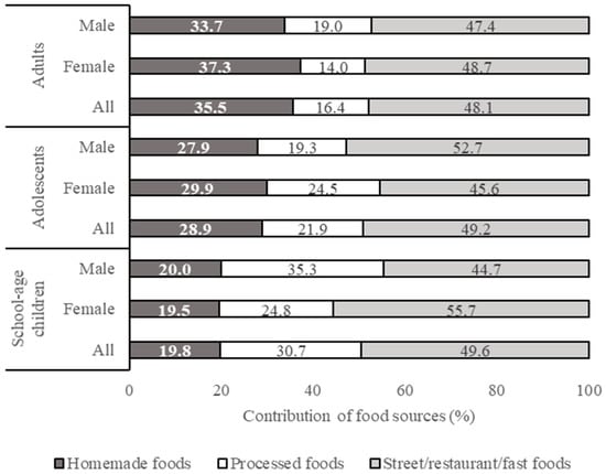 The differences in the sources of food consumed by different respondents’ groups can be seen in Figure 1. Water/mineral water was excluded from the calculation of food sources contribution to the total food consumption. The total consumption of food, excluding water, ranged from 1213 (by school age girls) to 1568 (by adult males) g/capita/day. Adult respondents consumed homemade (567–577 g/capita/day) and street/restaurant/fast foods (502–604 g/capita/day) in a higher amount than processed foods (256–387 g/capita/day). This tendency was also found in the adolescent respondents. The school-age respondents were observed to consume the lowest amount of homemade food (291–391 g/capita/day) compared to the other respondent groups. Street/restaurant/fast foods (500–602 g/capita/day) dominated in their food consumption, followed by processed food (319–484 g/capita/day).