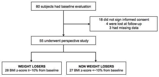 Of the 80 subjects who underwent baseline evaluation [], 62 agreed to participate to the longitudinal study while 18 refused to sign the consent and were excluded. During the study protocol, 4 participants (6.5%) were lost at follow-up and some data were missing in 3 subjects (4.8%), and thus they were excluded from the final study population. Out of 55 subjects, 28 (51%) were considered WL and 27 (49%) NWL based on a negative change in BMI z-score ≥10% from baseline (Figure 1).