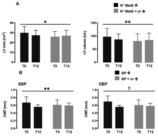 (A) Variations of LV area and volume after a 12-month healthy lifestyle intervention in subjects with (black bars) or without (grey bars) a reduction of the number of metabolic syndrome (MetS) criteria according to NCEP-ATPIII classification []. (B) Variations of CIMT after a 12-month healthy lifestyle intervention in subjects with (black bars) or without (grey bars) a reduction of systolic (SBP) and diastolic (DBP) blood pressure. Data are expressed as marginal mean ± SEM. Data are significant in interaction (* p < 0.01; ** p < 0.05; † p < 0.007). T0: baseline; T12: after 12 months of behavioral intervention.