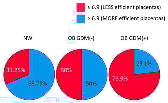 Interestingly, when using the median value of placental efficiency (6.9) as a cut-off to split placentas into subgroups of different efficiency, we found a significant difference in their distribution among the three study groups (chi-square test: χ2 (1, n = 47) = 6.001, p = 0.049, Φ = 0.36). Indeed, most of the placentas from NW women (68.75%), but only 23.1% of those from OB GDM(+) women, were in the “more efficient” subgroup. Differently, OB GDM(−) placentas were equally distributed in the two subgroups of efficiency (50%) (Figure 1).