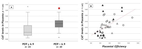 CAT placental levels (A) according to placental efficiency (PEff) cut-off and (B) in relation to PEff. (A) Data are shown as box plots, indicating the median and the 25th and 75th percentiles; ° values that extend more than 1.5 box-lengths from the edge of the box. * p < 0.05 (t-test); (B) statistical analysis by the Spearman rank order correlation (r = +0.6, p < 0.001) in NW (○), OB GDM(−) (▲), OB GDM(+) (▲).