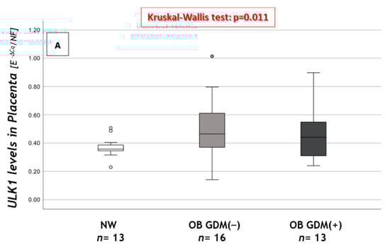 As regards macroautophagy, ULK1 showed significantly increased placental mRNA levels in the OB groups compared to NW (Figure 3A).