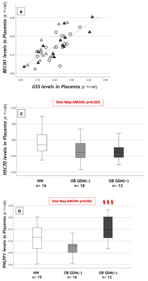 We found a decrease, though not significant, of placental antioxidant defense genes (CAT, GSS, GPX1) in OB GDM(−), but not in OB GDM(+), compared to NW. Interestingly, CAT was strongly correlated with placental efficiency and had significantly lower levels in less efficient placentas. Among genes playing an important role in macroautophagy, placental ULK1 was increased in OB groups compared to NW, while BECN1 presented a strong and positive correlation with GSS gene expression. The chaperone-mediated autophagy regulator PHLLP1 was reduced in OB GDM(−) placental tissues compared to NW and significantly increased in OB GDM(+) compared to OB GDM(−). PHLLP1 also correlated with HSC70 in NW placental tissues, but not in OB populations. Other CMA-related genes (NRF2, HIF-1a, VEGF) did not show significant differences in obesity and GDM.