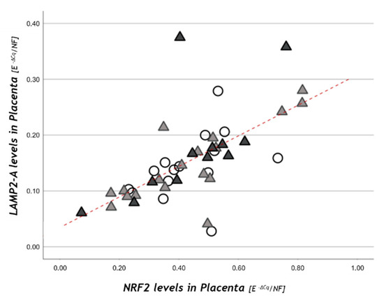 NRF2 placental levels resulted in being significantly correlated with LAMP-2A in the study population (r = +0.73, p < 0.001; Figure 4) and within each study group.