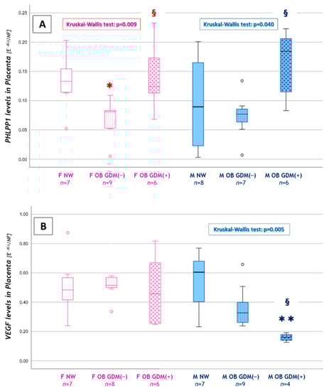 Finally, a significant reduction in VEGF expression was observed in males’ placentas in the OB GDM(+) group (0.159 ± 0.027) when compared to both OB GDM(−) (0.365 ± 0.140) and NW (0.539 ± 0.212). VEGF gene expression was also lower, though not significantly, in OB GDM(−) male placentas vs. NW (Figure 5B).