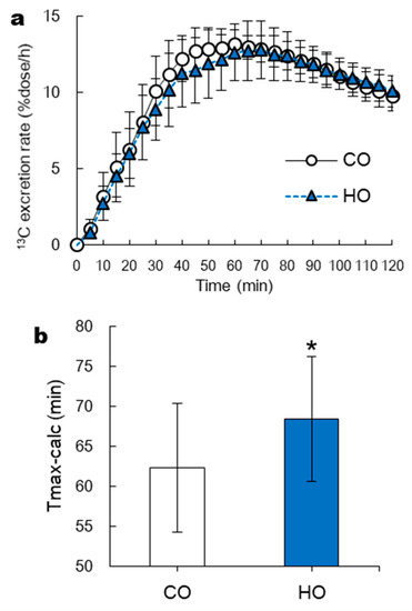 Time course of 13C excretion responses (a) and Tmax-calc of 13C excretion rate (b) following consumption of pumpkin soup containing 9.2 g of either intact corn oil (CO) or heated corn oil (HO) (b) in Experiment 1. Mean ± SD. * p < 0.05 (CO vs. HO).