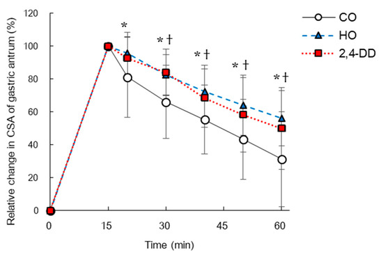 Time course of relative change in CSA of gastric antrum (i.e., % GE) following consumption of pumpkin soup containing 3.1 g of either intact corn oil (CO), heated corn oil (HO), or CO plus 1 mg of 2,4-decadienal (2,4-DD) in Experiment 2. At 15 min after consumption of pumpkin soup, CSA of the gastric antrum was defined as 100%. Mean ± SD. * p < 0.05 (CO vs. HO), † p < 0.05 (CO vs. 2,4-DD).