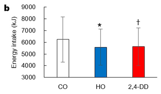 Food intake (a) and energy intake (b) at ad libitum test meal: 60 min after consuming pumpkin soup (240 g) containing 3.1 g of either intact corn oil (CO), heated corn oil (HO), or CO plus 1 mg of 2,4-decadienal (2,4-DD) in Experiment 2. Data are shown as mean ± SD. * p < 0.05 (CO vs. HO), † and (†) p < 0.05 and p = 0.06, respectively (CO vs. 2,4-DD).