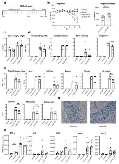 Figure 1. Effects of curdlan intake on dextran sodium sulfate (DSS) colitis in mice. (a) A schematic presentation of curdlan feeding in mice. (b) bodyweight changes of mice with and without DSS colitis, compared to day 0. (c) Colon weight normalized to length as an indication of inflammation. (d) Disease activity index according to [32]. (e) Mouse colitis histology index according to Table 1 [33]. (f) Representative picture of colon histology of vehicle- and curdlan-fed mice with DSS-induced intestinal inflammation, 10× magnification. (g) mRNA expression of TNF-α, IL-6, IL-10, NOS2 and CCL-2 in colon homogenates. The levels of mRNA were normalized for reference genes. Samples with no amplification were considered as 0. N = 4–5 for controls and 9–10 for DSS-subjected mice. Individual values are expressed as mean and standard error of mean. Statistical differences were tested by independent t-test, where a p-value of <0.05 was considered to be significant. * p-value <0.05; ** p-value < 0.01.