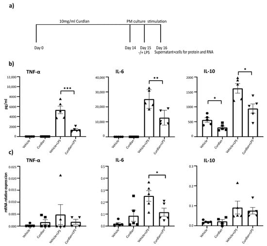 Figure 2. Curdlan intake results in reduced lipopolysachcharide (LPS) responses in peritoneal macrophages. (a) A schematic presentation of curdlan feeding in mice and peritoneal macrophage stimulation. (b) Cytokine response by peritoneal macrophages after LPS stimulation for 24 h. (c) mRNA gene expression levels of TNF-α, IL-6 and IL-10 after 24 h of LPS stimulation. The levels of mRNA were normalized for reference genes. Samples with no amplification and below detection levels were considered as 0. N = 3–5 for each condition. Individual values are expressed as mean and standard error of mean. Statistical differences were tested by independent t-test, where a p-value of < 0.05 was considered to be significant. * p-value < 0.05; ** p-value < 0.01; *** p-value < 0.001.