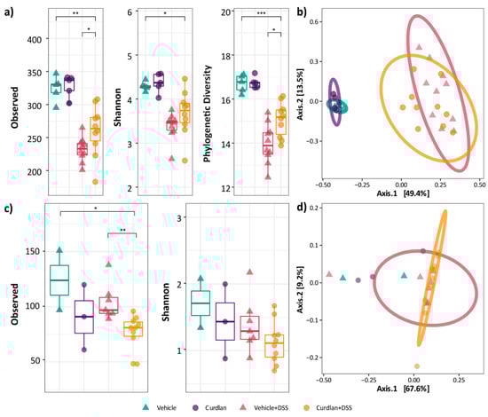 Figure 3. Effect of curdlan and DSS on the microbiome and mycobiome alpha and beta diversity. (a) For 16S sequencing, alpha diversity is measured by observed, Shannon and phylogenetic diversity matrices. (b) Beta diversity plots for 16S. (c) For ITS1 sequencing, alpha diversity is measured with observed and Shannon indices. (d) Beta diversity for ITS1 sequencing. Individual samples are represented as symbols. The observed species are plotted for vehicle (green), curdlan (purple), vehicle+DSS (pink) and curdlan+DSS (orange). Statistical differences were tested through Wilcoxon methods, where p-value of <0.05 was considered to be significant. * p-value < 0.05; ** p-value < 0.01; *** p-value < 0.001.