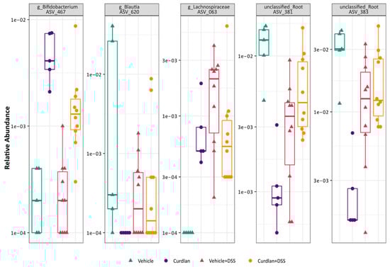 Figure 4. Abundance of bacterial taxa affected by curdlan. Phylogenetic diversity matrices are plotted for the observed species for vehicle (green), curdlan (purple), vehicle+DSS (pink) and curdlan+DSS (orange). Individual samples are represented as symbols. Statistical differences were tested through Wilcoxon methods, where p < 0.05 was considered to be significant.