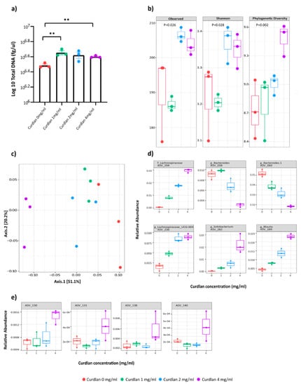 Figure 5. Effect of curdlan on human microbiota using in vitro i-screen. (a) Total DNA load of bacterial 16S as measured through qPCR. Statistical differences were tested by independent t-tests, where a p-value of < 0.05 was considered to be significant. ** p-value < 0.01. (b) For 16S sequencing, alpha diversity is measured by observed, Shannon and phylogenetic diversity metrics, and significance is tested using Kruskal–Wallis. (c) Effect of curdlan concentration on beta diversity (principal coordinate analysis (PCoA) Bray–Curtis dissimilarity)). (d) Boxplots for the top 6 most significant lineages (family and genus) that show linear relation with different curdlan concentrations. (e) Boxplots for 4 Bifidobacterium lineages with different curdlan concentrations.