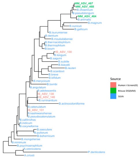 Not surprisingly, the bifidobacteria found in the human samples were completely different from the ones found in the mouse colon. To investigate the effects of curdlan on the specific beneficial bifidobacterial, as seen in mouse colon contents, a phylogentic tree was constructed (Figure 6) using ASVs, and bifidobacteria DSM and ATCC strain sequences obtained from the SILVA (version 132) database [43]. This was done for both sequences obtained from mouse colon contents and the human i-screen. The placement of bifidobacteria clearly shows the different species of the family present in mice and humans, respectively. The abundance of ASV_467 was found to be closely related to Bifidobacterium choerinum, which is only limited to mouse colon contents. Even though it is clear that mouse and human intestinal microbiota are not comparable, together these data suggest that curdlan can alter both human and mouse gut microbial composition.