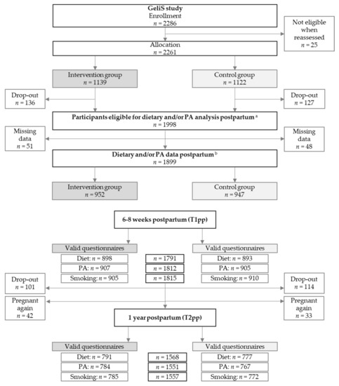 There is evidence that antenatal lifestyle interventions are able to improve maternal diet and PA during gestation [24,25] and achieve a reduction in excessive gestational weight gain (GWG) [26]. However, adhering to a healthy lifestyle during the postpartum period has been shown to be challenging, and several studies indicate a decrease in dietary quality and PA after delivery [27,28,29,30,31]. This might be attributed to factors, such as lack of time and sleep, parenting duties and prioritising competing responsibilities over health, which prevent women from implementing or maintaining a healthy diet and PA level [32]. Therefore, supporting women in achieving a healthy lifestyle already in pregnancy might help to sustain healthy routines after delivery. While the effects of lifestyle interventions on maternal diet and PA during pregnancy have been extensively studied [24,25,26], lasting intervention effects on maternal health behaviour in the postpartum period are poorly explored [33,34,35,36]. Moreover, interventions were primarily conducted under fairly controlled conditions in academic settings [26,37] rather than in a primary care setting. To address this research gap, this secondary analysis of the large-scale, cluster-randomised “Gesund leben in der Schwangerschaft” (GeliS; “Healthy living in pregnancy”) study investigated if a comprehensive lifestyle intervention, embedded in routine care, was able to influence maternal lifestyle during the first year postpartum.