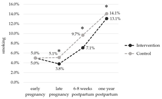 Percentage of smokers in the intervention and control groups from pregnancy to one year postpartum. Early pregnancy: IG: n = 47/931, CG: n = 46/922; late pregnancy: IG: n = 35/916, CG: n = 46/906; 6–8 weeks postpartum: IG: n = 64/905, CG: n = 88/910; one year postpartum: IG: n = 103/785, CG: n = 109/772. * p < 0.001.