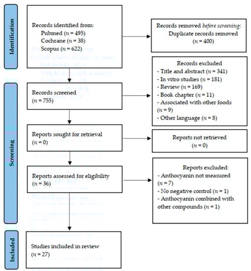 The flow diagram of the literature search and selection process was built in accordance with the Preferred Reporting Items for Systematic Reviews and Meta-Analyses (PRISMA) guideline (Figure 1). After the search in the selected databases, we identified 1155 articles (x = 495 Pubmed; x = 38 Cochrane and x = 622 Scopus). From these, 1117 were excluded for the following reasons: duplicate studies (n = 400), title and abstract not suited to the topic (n = 341), in vitro studies (n = 181), review articles (n = 169), book chapters (n = 11), supplementation of anthocyanin associated with other foods (n = 9), and other languages than English used (n = 8). After, 36 articles were read fully. From these, we excluded nine articles: total of anthocyanin not measured (n = 7); there was no negative control without intervention (n = 1); and anthocyanins were combined with other compounds (n = 1). Therefore, 27 studies were included in this systematic review.
