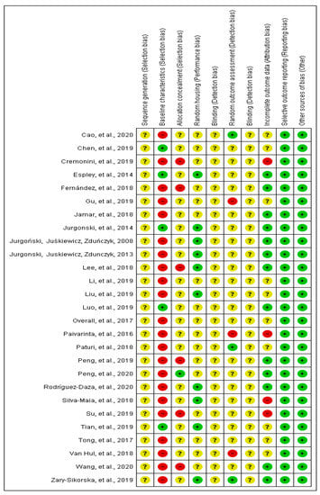 From all the studies that were included in the current systematic review (n = 27), the baseline characteristics, including sex, age and initial weight of animals, were complete in five studies [18,22,23,31,43]. In most of the studies, the allocation of animals was not described in detail, since there was no information about the randomization process. Six studies did not mention if the animal allocation to treatment groups was performed randomly [20,21,25,27,37,39]. Furthermore, none of the studies reported about blinding the investigators involved in the research. Four studies did not include all animals in the analysis, and the exclusion criteria were not reported [21,27,32,41] (Figure 2).