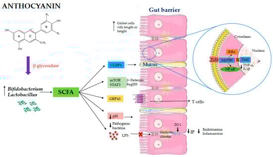 Dietary anthocyanins undergo a specific metabolism with the absorption rate depending on their structure. Briefly, anthocyanins cross the gastric mucosa in their intact form. Thereafter, in the small intestine, mainly in the jejunum, they are absorbed by hydrolytic enzymes as phenolic aglycone. The unabsorbed anthocyanins reach the colon, and are metabolized by the colon microbiota, especially by genera and species that are equipped with enzymes such as β-glucosidase, which are necessary to catalyze the reaction. Intestinal bacteria such as Bifidobacterium spp. and Lactobacillus spp. possess these enzymes; thus, the anthocyanin metabolism by microbiota and/or their metabolites can modulate the growth of these specific bacteria [9,10,11]. In this sense, the modulation of gut microbiota by anthocyanin increases the short chain fatty acids (SCFA) producing bacteria, which acidifies the intestinal pH and inhibits the pathogenic bacteria proliferation, and SCFA as butyrate act as a fuel to provide energy for epithelial cells, thus improving the intestinal barrier to avoid the translocation of pathogens and antigens [12]. Thereby, it is suggested that the potential beneficial functions of anthocyanins could be indirectly attributed to the gut microbiota modulation and consequent production of metabolites due to bacterial fermentation activities, which improve several parameters related to the intestinal health [9,13].