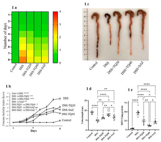 The DSS-induced colitis group showed markedly increased DAI scores compared with the control group (p < 0.0001). TQ treatment (20 and 40 mg/kg body weight) in DSS-colitis animals dose-responsively (p < 0.01 and p < 0.0001) improved the DAI scores. As a positive control, SAZ treatment also showed a significant improvement in DAI score (Figure 1a,b) as shown in the heatmap and the line diagram.