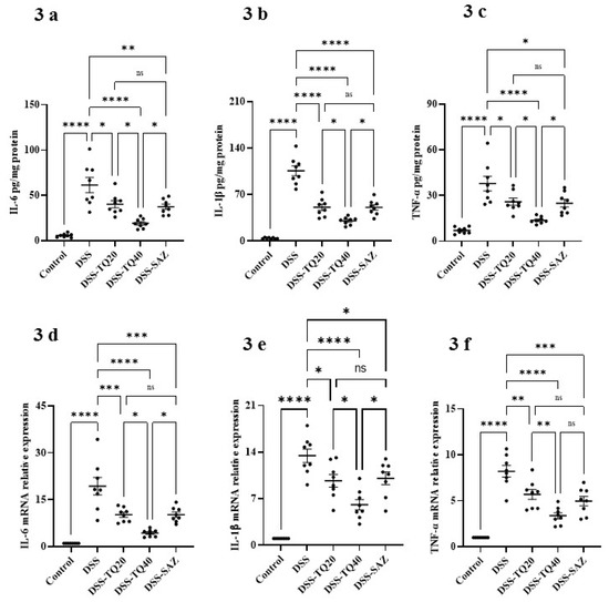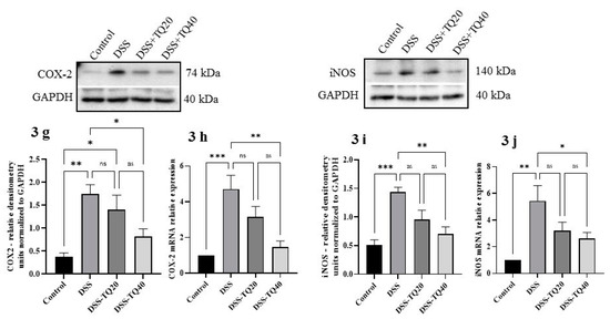 Figure 3. Effects of TQ on proinflammatory cytokines and mediator protein and mRNA expression. TQ treatment significantly prevented the DSS-induced increases in concentrations of proinflammatory cytokines both at protein (IL-6 (a), IL-1β (b), and TNF-α (c)) and mRNA expression levels (IL-6 (d), IL-1β (e), and TNF-α (f)) in DSS-induced colitis group. Similarly, TQ treatment also significantly decreased COX-2 and iNOS levels both at protein and mRNA levels in the DSS-induced colitis group (gj). The density of the immunoblots was normalized to GAPDH as an internal control. n = 8 animals used for obtaining data for proinflammatory cytokines (IL-6, IL-1β, and TNF-α protein and mRNA) and n = 4 animals used in each group for proinflammatory mediators (COX-2 and iNOS protein and mRNA) expression studies. The data expressed as means ± SEM. **** p < 0.0001, *** p < 0.001, ** p < 0.01, and * p < 0.05. (NS) not significant.