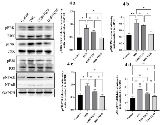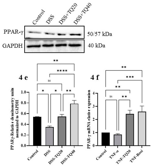 Figure 4. Effect of TQ on MAPK, NF-κB signaling pathways, and PPAR-γ protein and mRNA expression. (ac) TQ treatment significantly prevented the increase in the phosphorylation of the protein kinase p-ERK, p-JNK, and p-p38 in the DSS-induced colitis group. Similarly, (d) TQ treatment significantly inhibited the increase in the phosphorylation of NF-κB protein in the DSS-induced colitis group. (e,f) TQ treatment significantly increased PPAR-γ expression both at protein and mRNA levels in the DSS-induced colitis group. The density of the immunoblots was normalized to GAPDH. n = 4 animals used in each group to obtain the data for protein and mRNA expression studies. The data expressed as means ± SEM. **** p < 0.0001, *** p < 0.001, ** p < 0.01, and * p < 0.05. (NS) not significant.