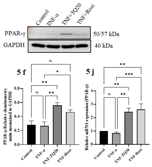 Figure 5. Effect of TQ on cell viability, proinflammatory chemokine mRNA, and PPAR-γ protein and mRNA expression in TNF-α challenged HT-29 human colon cancer cells. (a,b) A concentration-dependent cytotoxic effect of TQ was determined. (ce) TQ treatment dose-dependently prevented the increase in CXCL-1, IL-8, chemokine, and COX-2 mRNA expression in TNF-α (1 ng/mL) challenged HT-29 cells. (f,j) TQ significantly increased PPAR-γ transcription factor protein, and mRNA expression in TNF-α challenged HT-29 cells. The density of the immunoblots was normalized to GAPDH. n = 4 separate experiments used for obtaining the data for protein and mRNA expression studies. The data expressed as means ± SEM. p ≤ 0.05 considered statistically significant. **** p < 0.0001, *** p < 0.001, ** p < 0.01, and * p < 0.05. (NS) not significant.