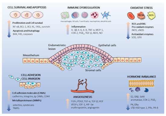 Schematic representation of dysregulated physiological processes in the endometriotic lesion. Endometriotic lesions consist of epithelial and stromal endometrial cells originating form retrograde menstruation. The endometrial cells subsequently attach to the underlying peritoneal mesothelium, proliferate, and initiate pro-endometriotic microenvironment formation. Cell proliferation and resistance to apoptosis, cell adhesion, inflammation, oxidative stress, and hormone signaling are augmented by the interactions of multiple cells and secretion of cytokines, chemokines, and hormones, which facilitate endometriotic lesion progression. This figure was made using graphic components obtained from the website: www.servier.com/powerpoint-imagebank (15 March 2021). Abbreviations used in graphics: 17β-HSD type 2, 17β-hydroxysteroid dehydrogenase type 2; BAX, BCL-2 associated X protein; BCL-XL, B-cell lymphoma-extra large; BCL-2, B-cell lymphoma 2; COX-2, cyclooxygenase-2; eNOS, endothelial nitric oxide synthase; ERα, estrogen receptor alpha; ERβ, estrogen receptor beta; E2, estradiol; FAS, tumor necrosis factor receptor superfamily member 6; FASL tumor necrosis factor ligand superfamily member; FGFs, fibroblast growth factors; GPX, glutathione peroxidase; HGF, hepatocyte growth factor; HIF-1α, hypoxia-inducible-factor 1-alpha; IL-1β, interleukin 1β, IL-6, interleukin 6; IL-8, interleukin 8; iNOS, inducible nitric oxide synthase; MCP-1, monocyte chemoattractant protein 1; NF-κB, nuclear factor kappa B; NO, nitric oxide; PGE2, prostaglandin E2; PR-B, progesterone receptor isoform B; P4, progesterone; ROS, reactive oxygen species; RNS, reactive nitrogen species; SDF-1, stromal-cell-derived-factor 1; StAR, steroidogenic acute regulatory protein; SOD, superoxide dismutase; TGF-α, transforming growth factor alpha; TGF-β, transforming growth factor beta; TIMP-1, tissue inhibitor of metalloproteinase-1; VEGF, vascular endothelial growth factor.