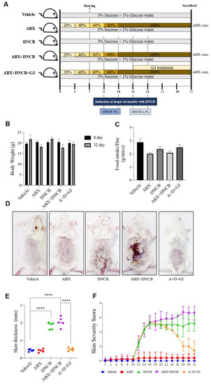Effect of GJ on AD-related symptoms in ABX-induced AD mice. (A) Experimental scheme of animal study. Time-dependent changes in (B) body weight and (C) food intake per day (g/mice) were measured. Vehicle: normal control group; ABX: antibiotic cocktail-administered group. (D) Visual observation of dorsal skin was made and (E) the dorsal thickness was measured using a Vernier caliper. (F) The skin severity score was visually evaluated between 1 and 10 points. Vehicle: normal control group; ABX: antibiotic cocktail-administered group; DNCB: DNCB-applied group; ABX+DNCB: antibiotic cocktail-administered and DNCB-applied group; A+D+GJ: antibiotic cocktail-administered and DNCB-applied group fed with GJ. **** p < 0.001.