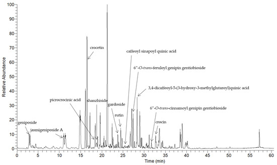 To validate the compounds composing GJ, we performed an LC-MS-MS analysis. The chromatography analysis allowed us to identify components including geniposide, jasmigeniposide A, crocetin, picrocrocinic acid, shanzhiside, gardoside, rutin, caffeoyl sinapoyl quinic acid, 6”-O-trans-feruloyl genipin gentiobioside, 3,4-dicaffeoyl-5-(3-hydroxy-3-methylglutaroyl) quinic acid, 6”-O-trans-cinnamoyl genipin gentiobioside, and crocin (Figure 2 and Table 4).