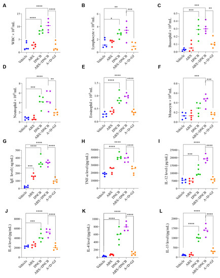 Effect of GJ on blood cell composition and serum cytokine expression in ABX-induced AD mice. The number of (A) total WBCs, (B) lymphocytes, (C) basophils, (D) neutrophils, (E) eosinophils and (F) monocytes was evaluated by a HEMAVET 950 blood analysis system in blood samples from mice. Serum expression level of (G) IgE, (H) TNF-α, (I) IL-12, (J) IL-6, (K) IL-4 and (L) IL-13 were measured by ELISA. Vehicle: normal control group; ABX: antibiotic cocktail-administered group; DNCB: DNCB-applied group; ABX+DNCB: antibiotic cocktail-administered and DNCB-applied group; A+D+GJ: antibiotic cocktail-administered and DNCB-applied group fed with GJ. * p < 0.05, ** p < 0.01, *** p < 0.005 and **** p < 0.001.