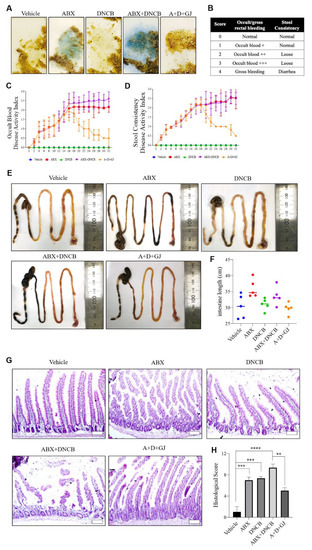 Effect of GJ on pathological changes to the intestine in ABX-induced AD mice. (A) Rectal bleeding was measured with a Hemoccult Sensa® kit. Blue coloration indicates rectal hemorrhage. (B) Score table proposed based on manufacturer’s guidelines. (C) Occult blood DAI and (D) stool consistency DAI were evaluated. (E,F) The length of the intestine of each group was measured. (G) H&E staining (magnification ×100) was performed to evaluate intestinal villi length and (H) histological scoring of intestinal injury was evaluated. Vehicle: normal control group; ABX: antibiotic cocktail-administered group; DNCB: DNCB-applied group; ABX+DNCB: antibiotic cocktail-administered and DNCB-applied group; A+D+GJ, antibiotic cocktail-administered and DNCB-applied group fed with GJ. ** p < 0.01, *** p < 0.005 and **** p < 0.001.