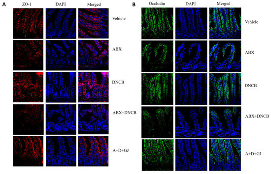 Effect of GJ on intestinal tight junctions in the intestine of ABX-induced AD mice. IF staining (magnification ×200) of (A) ZO-1 and (B) occludin was performed in the intestinal tissue of mice. Vehicle: normal control group; ABX: antibiotic cocktail-administered group; DNCB: DNCB-applied group; ABX+DNCB: antibiotic cocktail-administered and DNCB-applied group; A+D+GJ: antibiotic cocktail-administered and DNCB-applied group fed with GJ.