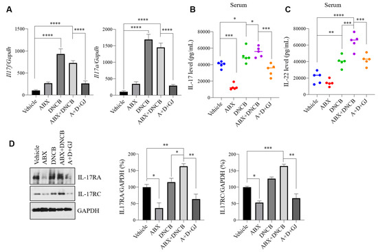 Th17 cells are important mediators of various immune-related disorders, and among the members of the IL-17 family produced by Th17 cells, IL-17A and IL-17F are the most closely related factors, sharing 55% homology. IL-17A mediates host resistance to extracellular bacterial and fungal infections by acting as a powerful inducer of neutrophil growth factors, such as granulocyte colony stimulating factor (G-CSF) and cytokines IL-1β, IL-9, and IL-12p70. On the other hand, IL-17F plays an important role in the responses of neutrophils against inflammation through the regulation of chemokines and cytokines such as IL-1β, IL-9, and IL-12p70, and GM-CSF release in macrophages [36]. Notably, Th17 responses are considered as a candidate mechanism which links the role of the gut microbiome to the pathology of AD [37]. DNCB-induced AD also displays Th17-related immune responses [7]. Thus, to investigate the response Th17 cells, mRNA levels and protein expression levels of the IL-17 family were measured (Figure 7). The mRNA levels of Il17f and Il17a showed the tendency to increase in microbiome-depleted mice, but were significantly increased in DNCB-applied mice compared with vehicle control, while ABX mice exposed to DNCB also showed a similar increase in the expression of both genes (Figure 7A). Interestingly, when IL-17 serum cytokine levels were measured, ABX administration resulted in highly suppressed IL-17 expression, but the expression of IL-17 increased when mice were co-treated with DNCB. GJ was able to reduce the overexpression of IL-17 (Figure 7B). The serum level of IL-22 showed consistent changes (Figure 7C). Similarly, the protein levels of the IL-17 receptors, IL-17RA and IL-17RC, were suppressed when the intestinal microbiome was depleted, but were increased upon DNCB application. GJ-treated mice showed expression levels of these proteins at a similar level with normal control mice (Figure 7D). In addition, GJ treatment effectively suppressed the increase of IL-17-related markers, suggesting its beneficial effect in AD.