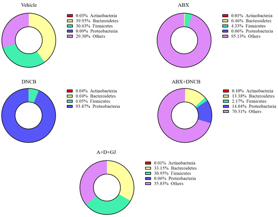 Effect of GJ on gut microbiome composition in ABX-induced AD mice. The shifts in microbiome phylum ratio in each group were investigated by 16s rRNA sequencing. Vehicle: normal control group; ABX: antibiotic cocktail-administered group; DNCB: DNCB-applied group; ABX+DNCB: antibiotic cocktail-administered and DNCB-applied group; A+D+GJ: antibiotic cocktail-administered and DNCB-applied group fed with GJ.