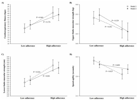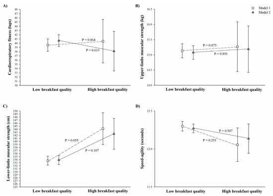 Analyses of covariance were performed using MDP and breakfast quality level (low vs. high) as fixed factors and physical fitness components (i.e., cardiorespiratory fitness, upper- and lower-limbs muscular strength, and speed–agility) as dependent variables. Analyses were adjusted for basic confounders (Model 1). In Model 2, we additionally adjusted for physical activity (i.e., moderate-to-vigorous physical activity and accelerometer awake wearing time). Regarding the MDP index, scores ≥ 7 were classified as average to optimal adherence (named as high adherence) to the MDP [], and according to the BQI, scores of ≥6 were categorized as medium to high breakfast quality (named as high quality) [].