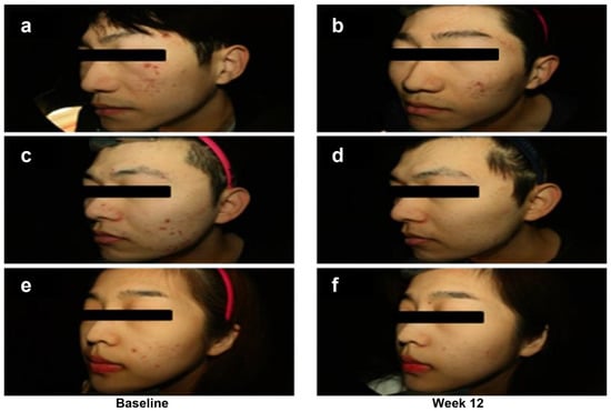 Despite sex imbalance in the placebo group (n = 14, 5 males and 9 females), sex was not a significant discriminating factor for the percent changes of acne lesion count and acne grade over 12 weeks (CJLP55 group: p = 0.539 in ILC, p = 0.244 in TLC, p = 0.383 in acne grade; placebo group: p = 0.917 in ILC, p = 0.699 in TLC, p = 1.000 in acne grade) in each group. Representative photographs of acne improvement in the CJLP55 group are shown in Figure 1.