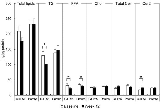 Altered levels of skin surface lipids in CJLP55 and placebo groups. Values are mean ± SEM (CJLP55 group: n = 14; placebo group: n = 14). Differences between baseline (white bars) and week 12 (black bars) in lipid fractions of the CJLP55 or placebo groups were evaluated using paired t-test test (Total lipids, Chol, Cer2) or Wilcoxon signed rank test (TG, FFA, Total Cer) (* p < 0.05). TG, triglycerides; FFA, free fatty acids; Chol, cholesterol; Cer, ceramides; Cer2, ceramide 2.