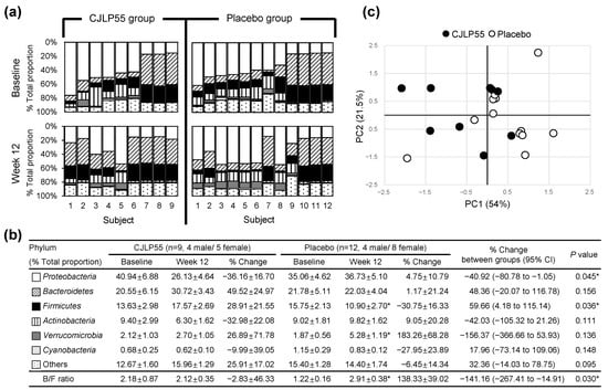 Compared to baseline, the proportion of Proteobacteria remained unchanged at 12 weeks in the CJLP55 and placebo groups, but the negative percent change of the CJLP55 group and the positive percent change of the placebo group over 12 weeks resulted in a significant difference between these two groups. The proportion of Firmicutes remained unchanged in the CJLP55 group, but it was decreased in the placebo group at 12 weeks; these alterations resulted in a 40.92% decrease (95% CI, −80.78 to −1.05; p = 0.045) of Proteobacteria and a 59.66% increase (95% CI, 4.18 to 115.14; p = 0.036) of Firmicutes over 12 weeks in the CJLP55 group compared to the placebo group (Figure 3a,b). Compared to baseline, the proportion of Verrucomicrobia was significantly increased in the placebo group; however, its similar trend noted at 12 weeks in the CJLP55 group resulted in no difference of percent change over 12 weeks between these two groups. The proportion of other phyla, including Bacteroidetes, Actinobacteria, Cyanobacteria and others (phyla present at less than 0.5%), remained unchanged over 12 weeks in the CJLP55 and placebo groups, thereby resulting in no difference in percent change of these phyla over 12 weeks between these two groups. However, despite no altered proportion of Bacteroidetes over 12 weeks, decreased proportion of Firmicutes induced a shift toward a significant increased Bacteroidetes:Firmicutes (B/F) ratio, a relevant biomarker of bacterial dysbiosis [16], in the placebo group, whereas its ratio remained unchanged in the CJLP55 group with no altered proportion of these two phyla over 12 weeks, therefore resulting in a 141.16% decrease (95% CI, −267.41 to −14.91; p = 0.030) of B/F ratio over 12 weeks in the CJLP55 group compared to the placebo group. The dysbiosis of urine bacterial EV phylum in the placebo group was further evident by PCA analysis. PCA scores for the CJLP55 group (filled circle in Figure 3c) were relatively separated from those for the placebo group (open circle in Figure 3c), which implies that there is a distinction of percent changes of urine bacterial EV phylum profiles between CJLP55 and placebo groups.