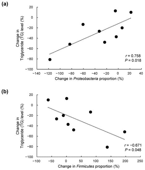 Correlations between percent changes in triglyceride levels and in (a) Proteobacteria and (b) Firmicutes proportions over 12 weeks in individual subjects of the CJLP55 group (n = 9).