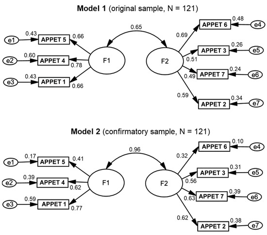 Confirmatory analysis models. F1 = factor 1 (related to the perceived flavor of the food); F2 = factor 2 (related to the perception of gastric fullness). Items: APPET 1 = “My appetite is…”; APPET 2 = “When I eat…”; APPET 3 = “I feel hungry…”; APPET 4 = “Food tastes…”; APPET 5 = “Compared to when I was younger, food tastes…”; APPET 6 = “Normally I eat…”; APPET 7 = “I feel sick or nauseated when I eat…”;. APPET refers to each one of the items of the appetite questionnaire.