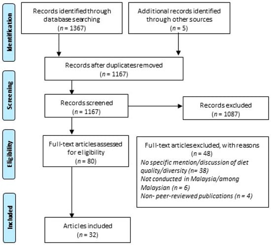 In this review, we have defined diet quality as an indicator of the extent to which a diet conforms to (i) general healthy eating principles of balance, variety, and moderation and (ii) recommended nutrient intake, including suggested limits to negative nutrients such as fat and salt intakes. The working definition of diet quality for this review specifically looks at the alignment of the diet with these principles as enshrined in the Malaysian Dietary Guidelines (1999 or 2010) [33,34] and Malaysian Recommended Nutrient Intake (2005, 2017) [35,36] that were current at the time the individual studies were conducted. We therefore included studies that used food/food group-based diversity indicators or food combination indices to evaluate dietary quality.