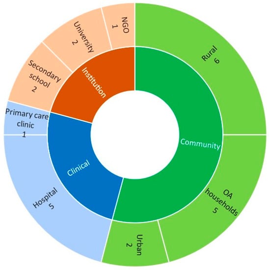 Distribution of the studies according to study setting or location. Note: OA = Orang Asli; NGO = Non-governmental organization.