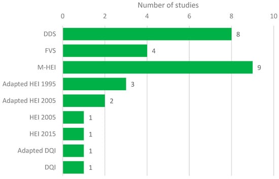 The Malaysian Healthy Eating Index (M-HEI) was the most commonly used diet quality measure (n = 9) in Malaysia (Figure 3), followed by the DDS (n = 8) and FVS (n = 4). A detailed description of the measures is presented in Supplementary Table S4.