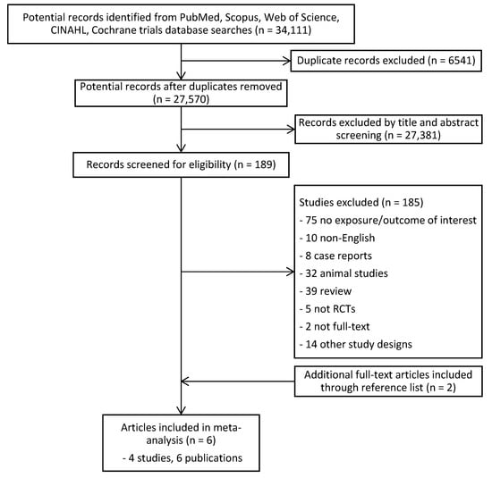 A total of 34,111 articles were identified. After the removal of 6541 duplicate records, 27,570 potential records were left. A total of 27,381 articles were excluded based on their titles and abstracts, resulting in 189 full-text articles being assessed for eligibility, as shown in Figure 1. Flow diagram of the literature search process. From that, 185 were excluded. In addition, two studies [13,14] were obtained through manual searching. Finally, a total of six studies were included for meta-analysis. Among the six published articles, two of the articles [13] and [23] were published based on the same cohort subjects from articles [14] and [24], respectively.
