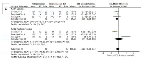 A subgroup analysis of four studies involving weight was performed. In the analysis for BW, the post-intervention subgroup showed SMD [(95% CI) = −0.34 (−1.33, 0.65), and the KD group has a small–moderate effect size on BW in this subgroup. As seen in Figure 3E, the overall effect for studies in baseline was p = 0.99 while in post-intervention was p = 0.50. The overall effects of both subgroups were insignificant. Both subgroups showed high levels of heterogeneity (baseline: I2 = 85%, post-intervention: I2 = 87%). There was no statistically significant subgroup effect (p = 0.61).